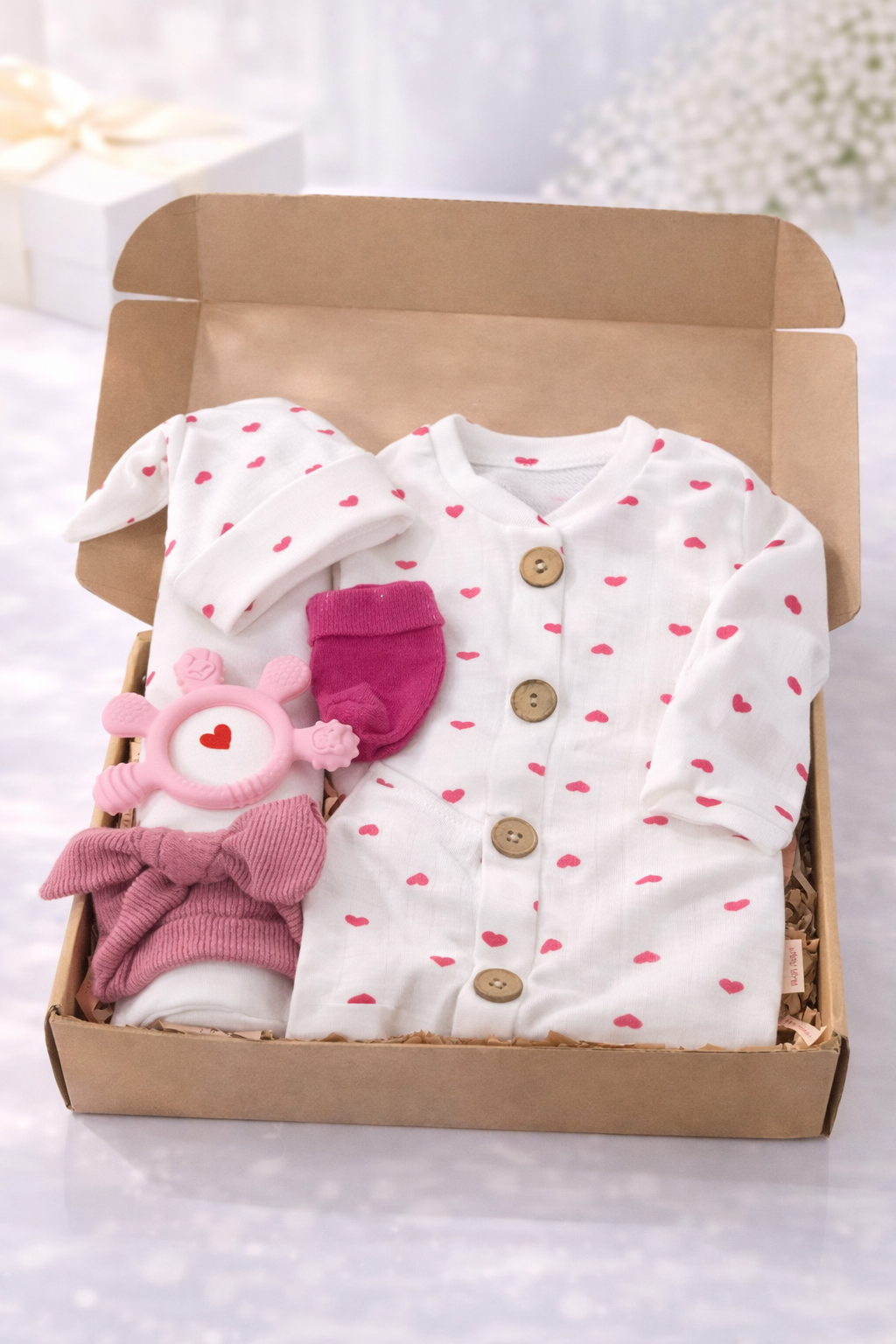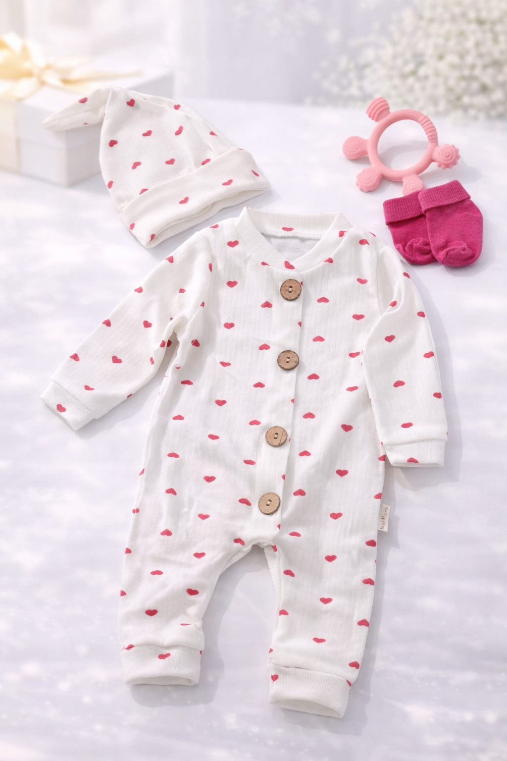 -Tahta Düğmeli, Bereli Kalp Desenli Bebek Tulumu